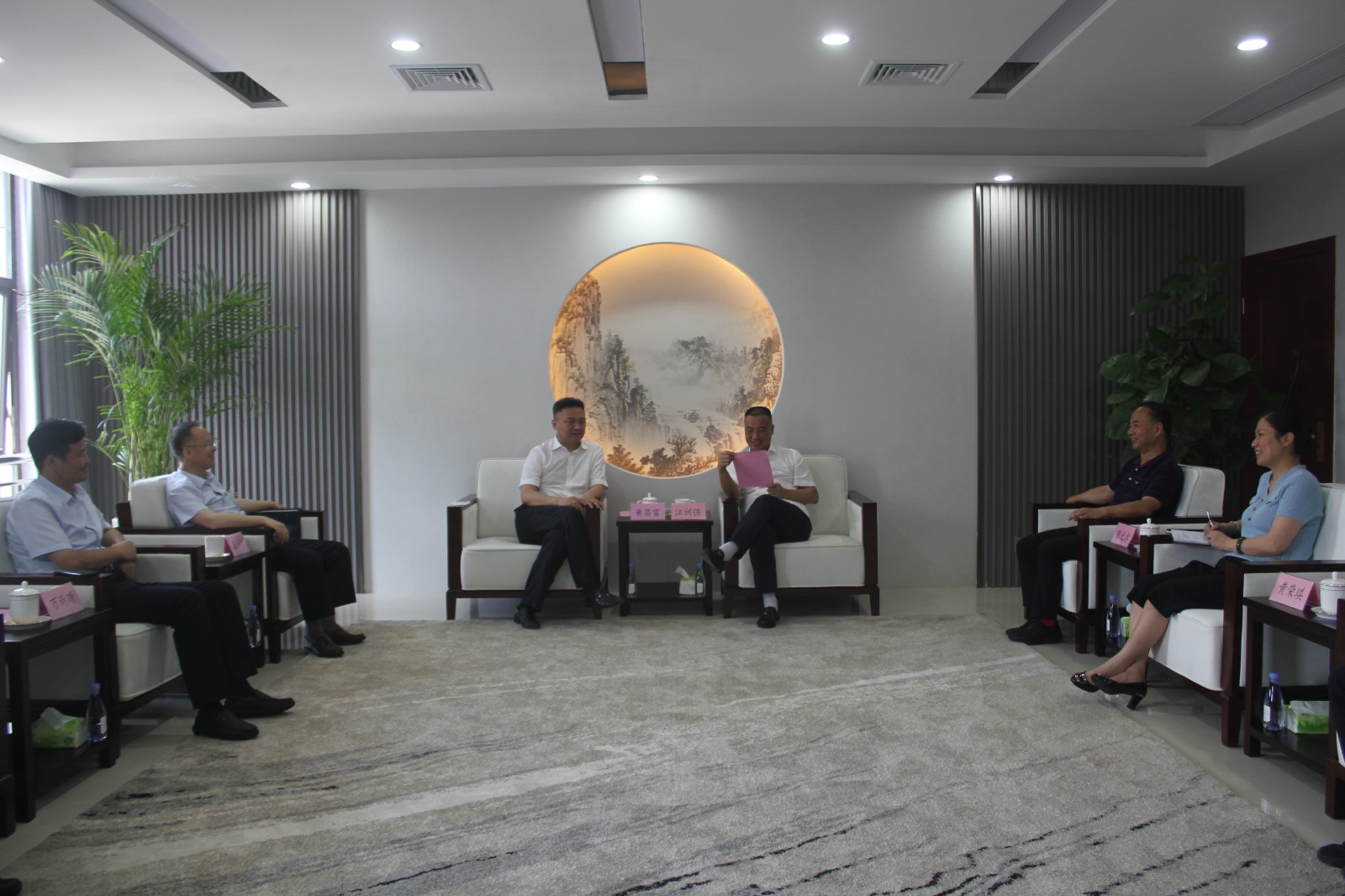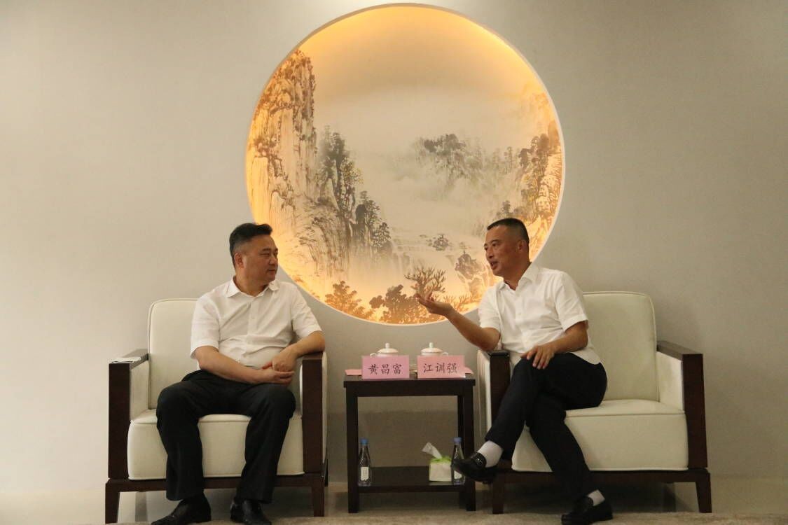 南平武夷发展集团党委书记、董事长江训强向黄昌富、王小川一行介绍了南平武夷发集团重组和重组后企业转型升级、投资经营、拓展新业务、延伸产业链条等方面情况。