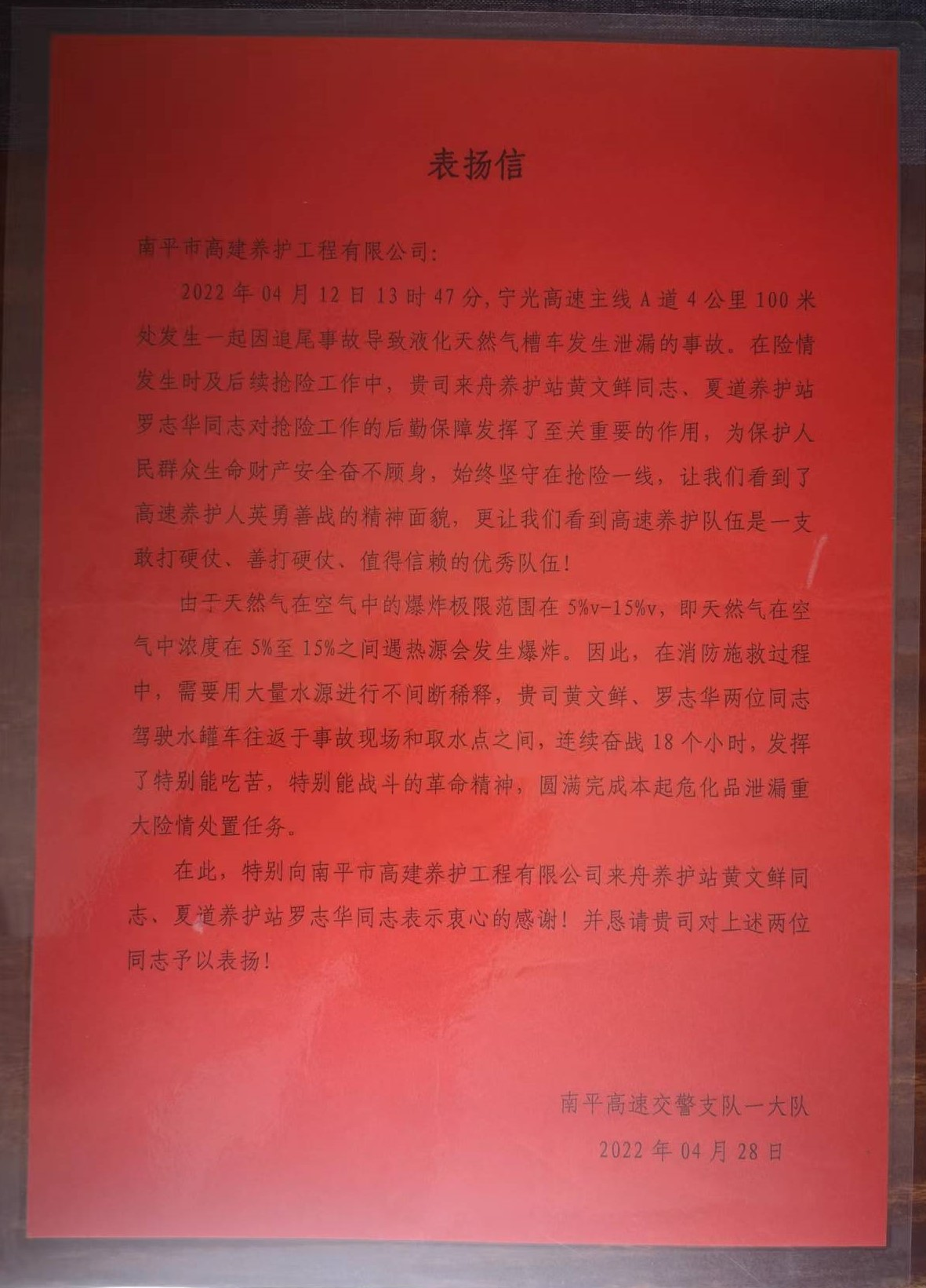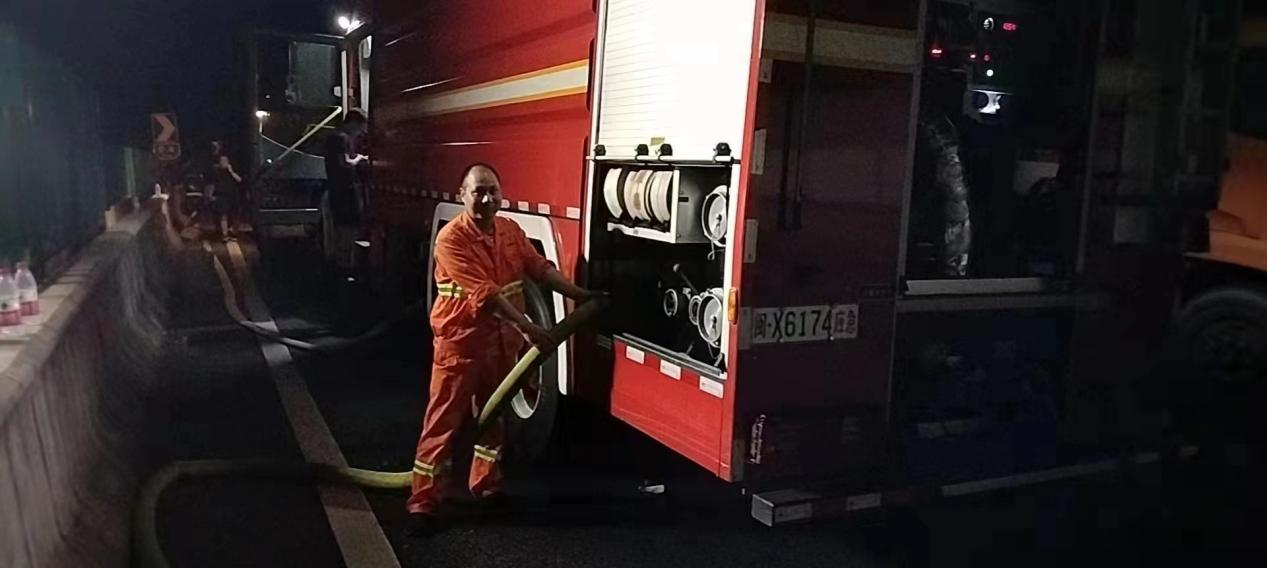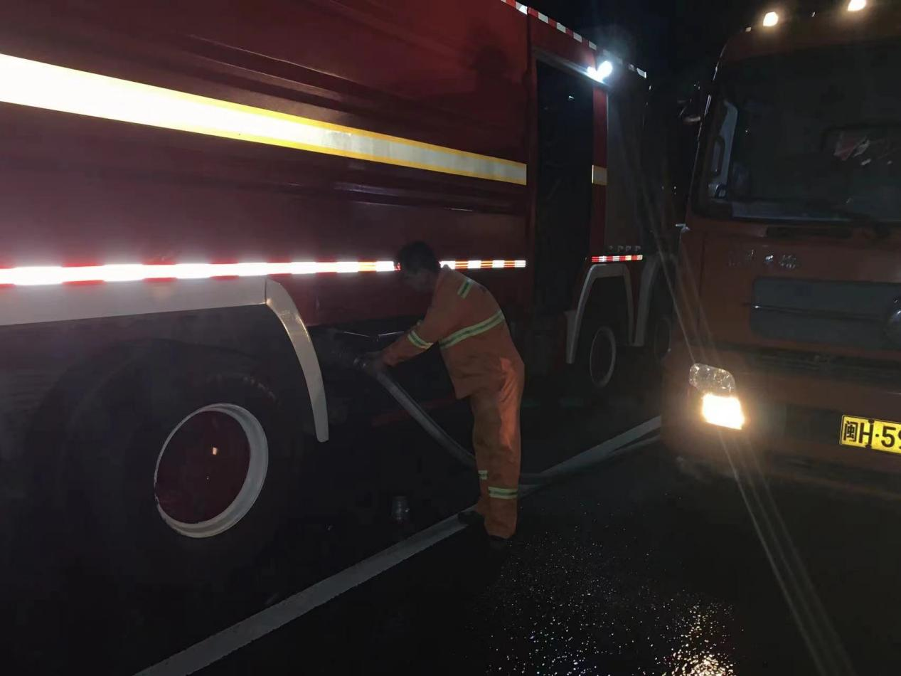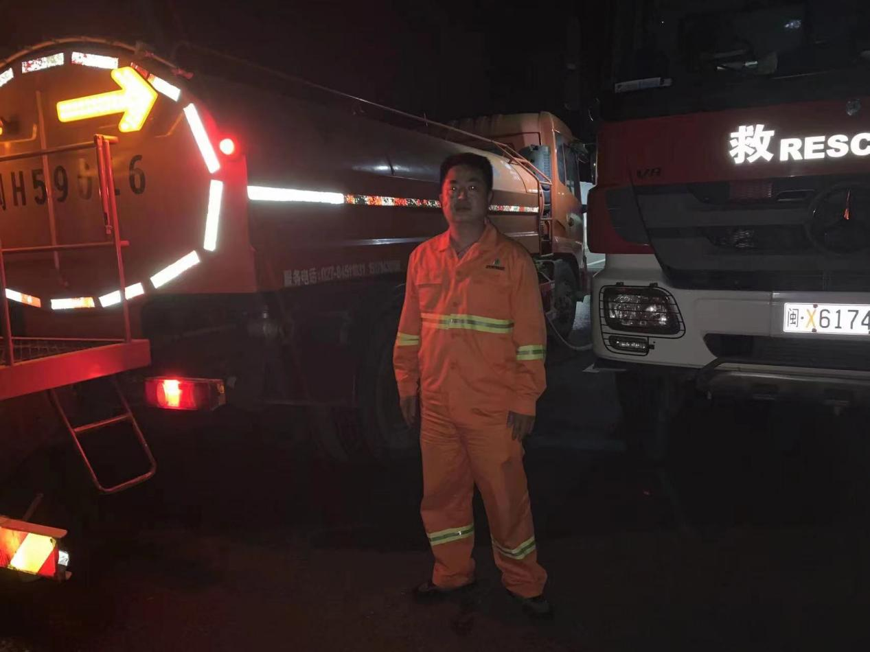 2022年4月12日宁光高速主线A道4公里100米处发生一起货车追尾天然气运输车导致液化天然气泄露事故,情况非常紧急,急需救援。南平市高建养护工程有限公司来舟养护站和夏道养护站接到上级救援命令后立即启动应急抢险预案,公司党支部党员来舟养护站副站长黄文鲜、夏道养护站员工罗志华两位同志在得知情况后主动请缨要求前往抢险现场参与救援任务,随后两人驾驶两台水罐车火速赶到救援现场进行喷水降温作业。养护职工发挥了特别能吃苦、特别能战斗的革命精神,经过18个小时的连续奋战,圆满完成此次危化品泄露重大险情处置任务,以实际行动诠释了共产党员吃苦在前、冲锋在前的先锋模范精神。