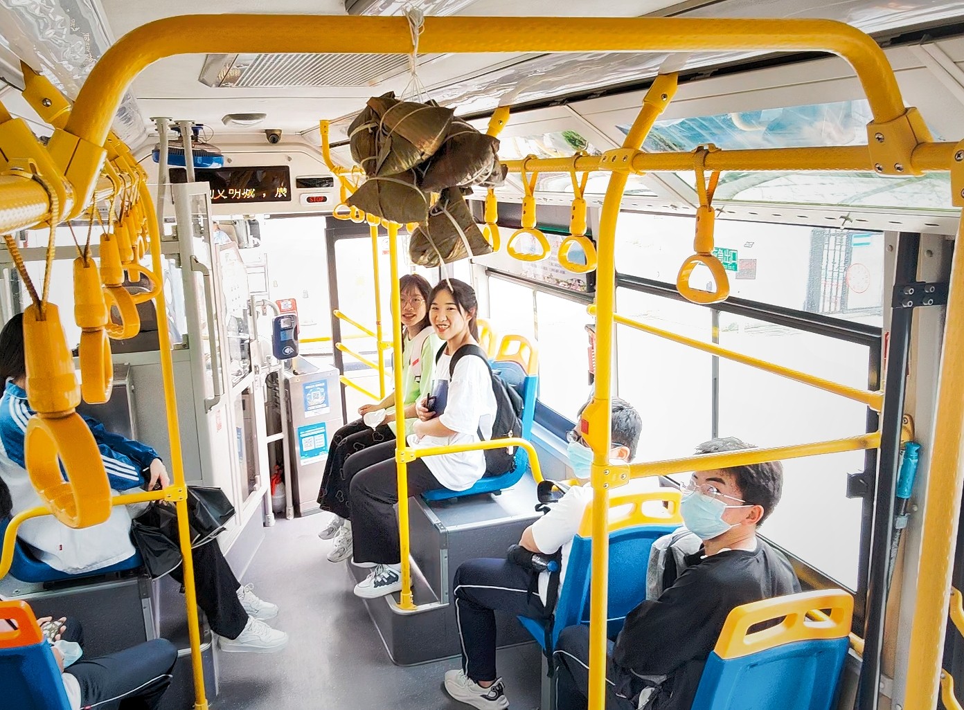除了做好常规工作外,两位师傅还向考生们送上了祝福:将一整串的粽子挂在车厢高处,寓意考生能“高中”。考生们上车后听到师傅的解说纷纷露出了笑脸,并为这种特别的祝福表示了感谢。