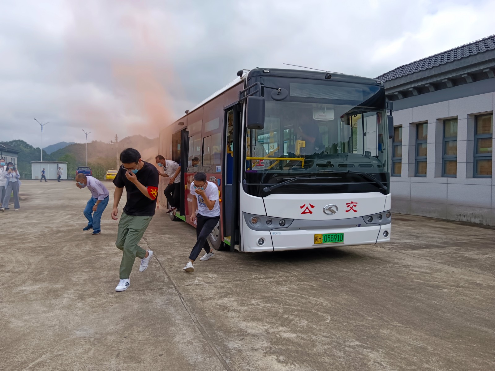 车辆自燃事件应急处置演练,模拟一辆载有数名旅客的公交车,在行驶途中突然发生自燃。驾驶员发现情况后引导乘客有序的撤离车辆。随后拨打火警电话及向公司汇报。拨打完电话,驾驶员取出车载灭火器进行初期灭火。公司抢险救援及治安维护小组接到命令赶赴现场救援。