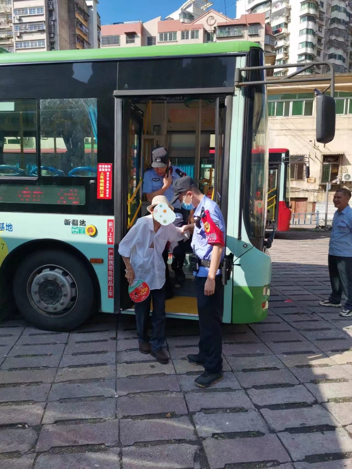 当天上午8:15左右,张斌如往常一样执行营运任务,车辆行驶至朝阳路口站点时,一位头发花白的老人上了车,动作有点迟缓,没有家属陪同。当车辆到达马站终点站后,车上的乘客纷纷下车,只有该老人依旧坐在座位上,神情恍惚,不愿下车。张斌连忙上前询问,可老人也置之不理,嘴里嘟嘟囔囔,却不知在说些什么。张师傅隐约感觉老人的精神状态可能有些问题,也不见有家人来公交站接,为防止老人贸然下车发生危险,于是立即报警,并把老人请到休息室坐下。