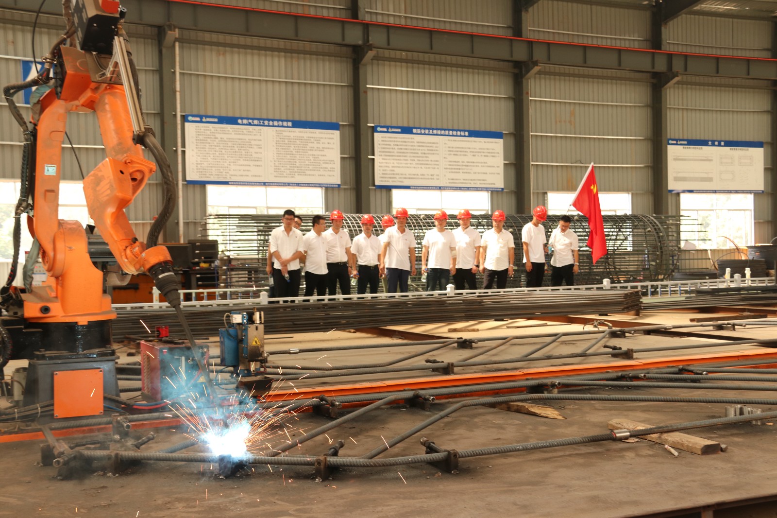 “现在我们看到的是钢筋焊接机器人,它具有稳定性和适应性,焊接接口做到无损伤,钢筋表面无锈蚀、焊接效果紧密有序。”来自高建公司党支部的党员,一边听着项目负责人曾荣焕的介绍,一边认真的看着钢筋焊接机器人施工作业。
