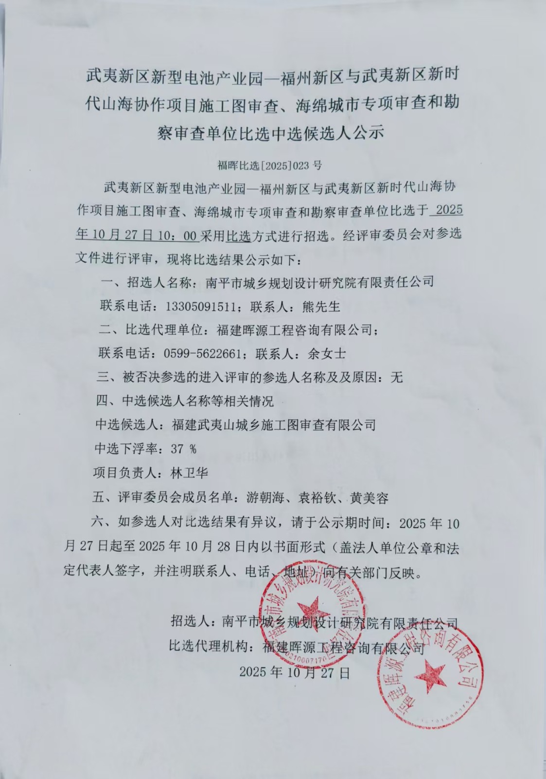 武夷新区新型电池产业园—福州新区与武夷新区新时代山海协作项目施工图审查、海绵城市专项审查和勘察审查单位中选候选人公示