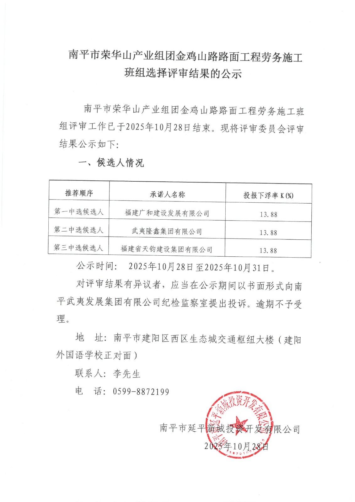 南平市荣华山产业组团金鸡山路路面工程劳务施工班组选择评审结果的公示
