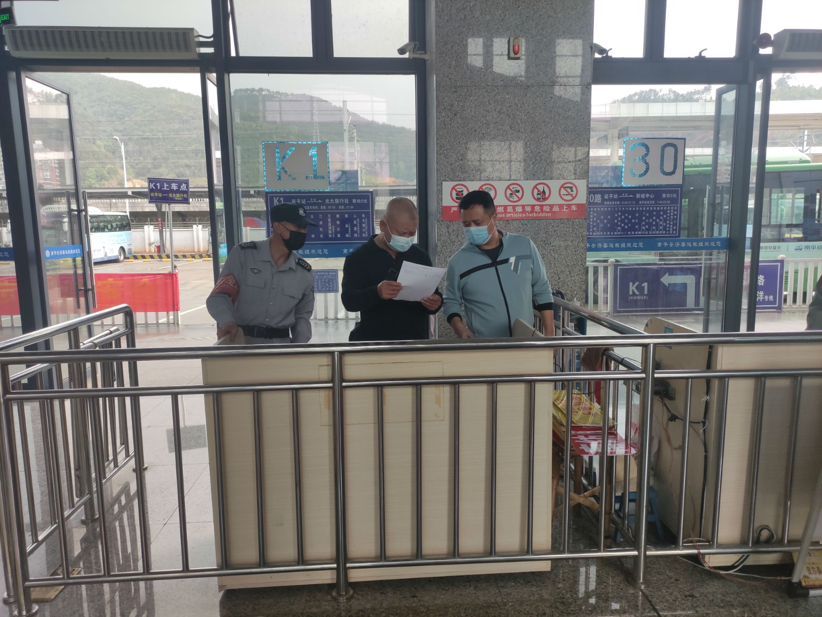 驾驶员在运营期间要全程佩戴口罩,并引导、督促乘客规范佩戴口罩,口罩佩戴率达到100%。加强高铁公交首末站防控,对进站乘客进行体温测量、落实“三码联查”、保持“一米线”排队乘车;设立了应急区,如发现乘客体温异常和健康码非绿码,立即将人员引导至应急区留观,并第一时间上报。延平站还增派一名队长在现场维持秩序,盯紧盯牢各项疫情防控措施的落实。