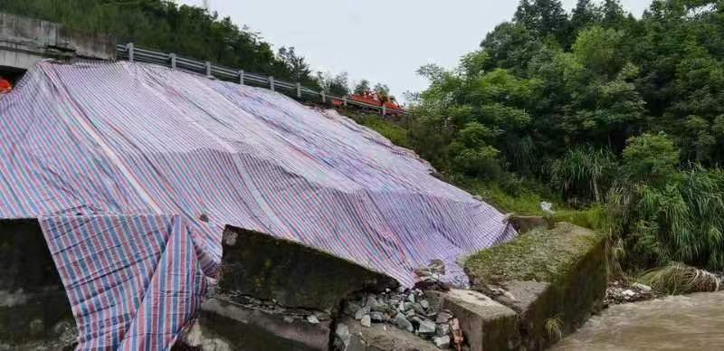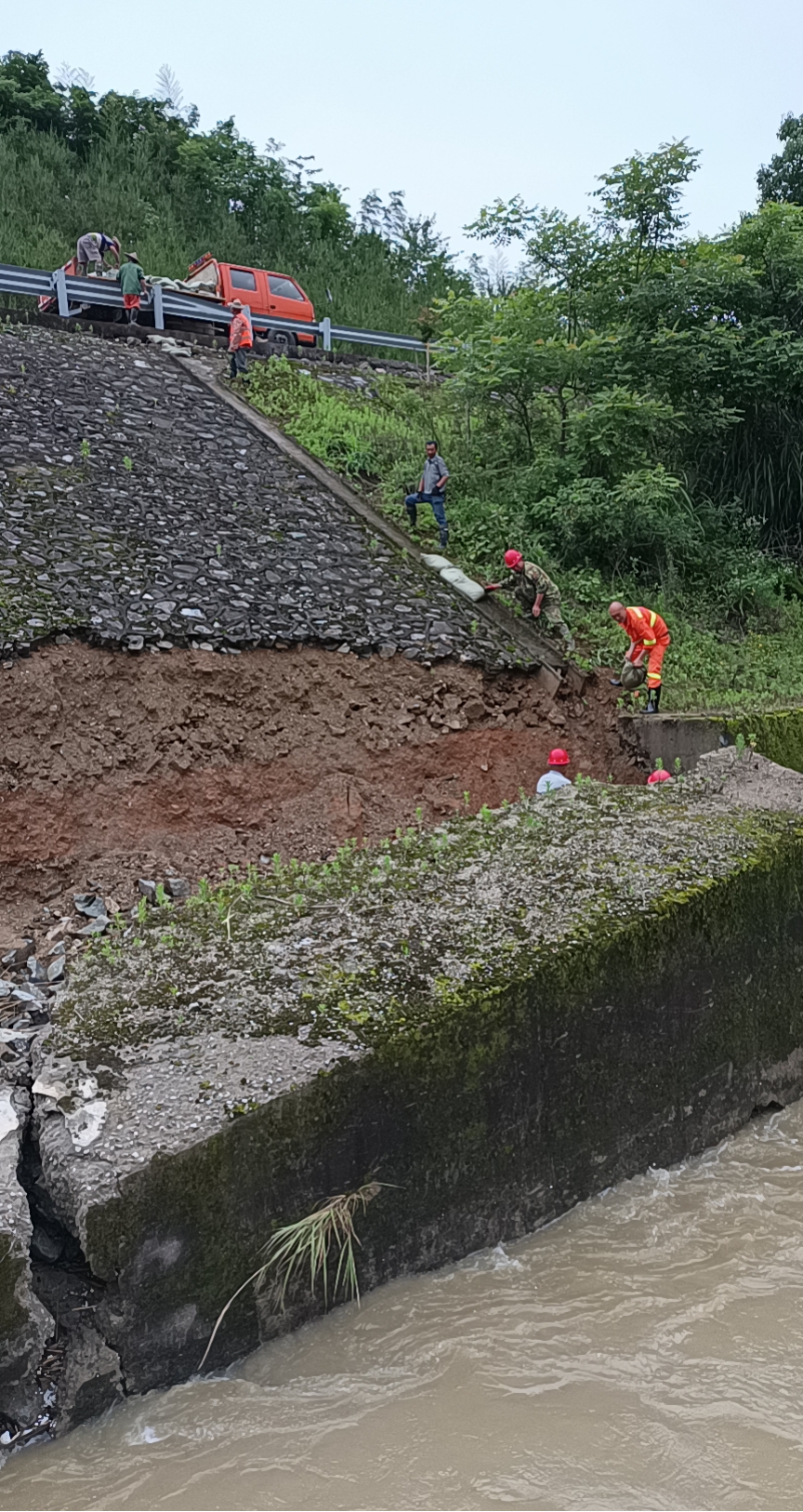 6月10日,受持续强降雨影响,S31线浦武高速龙浦段石犬二号桥发生水毁,造成锥坡坍塌,护岸断裂危及桥梁及路基安全放,浦城南养护站在路巡中发现这一险情后,立即向南平市高建养护工程有限公司汇报,公司第一时间启动应急抢险预案,迅速组织浦城南养护站全体人员及协作单位34人,抢险车辆、设备6台,紧急赶赴现场进行抢险。通过近10个小时不间断的持续奋战,截止6月10日晚上23点,险情已初步得到控制,后续将进一步采取措施,确保道路、行车安全。