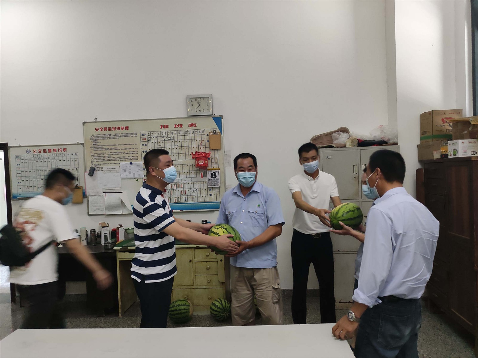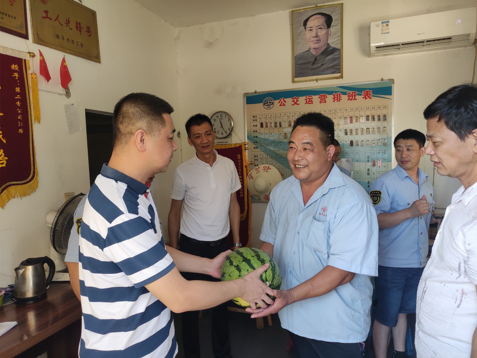7月11日,南平公交公司副总经理吴国胜、陈岩、工会主席郑芝联合南平城市公共交通乘客委员会茹建国、陈建仁、丁赛英委员,分赴公交线路、场站、维修厂开展送清凉慰问活动,给高温天气坚守岗位的驾驶员和维修工送上清凉解暑的西瓜和温馨的关爱,叮嘱大家防暑防晒多喝水,注意休息,平稳情绪,防止疲劳驾驶,保证有健康的身体和良好的状态为群众出行服务。