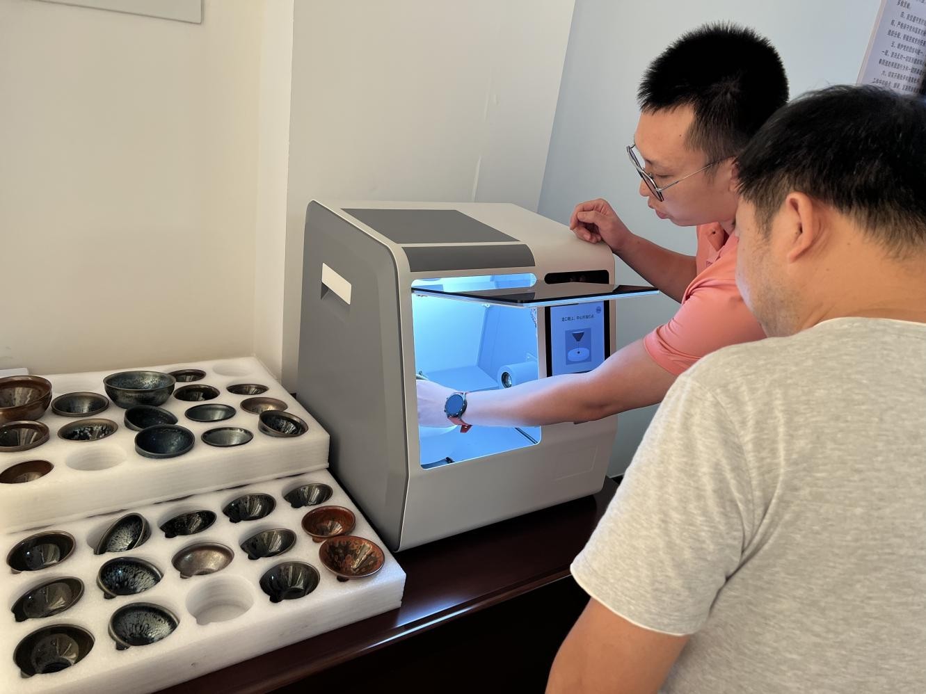 (图4:项目人员用新研发的建盏识别设备进行建盏溯源采集)