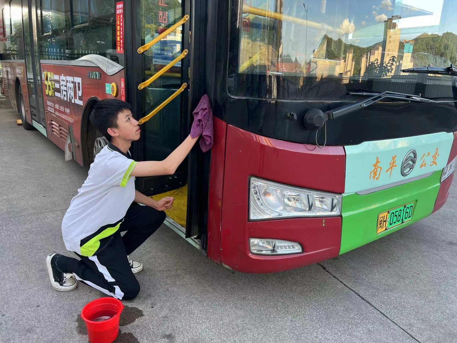 8月26日,十余名南平剑津中学八年级的学生自发组织到南平公交新城公交场站开展社会实践志愿服务活动。