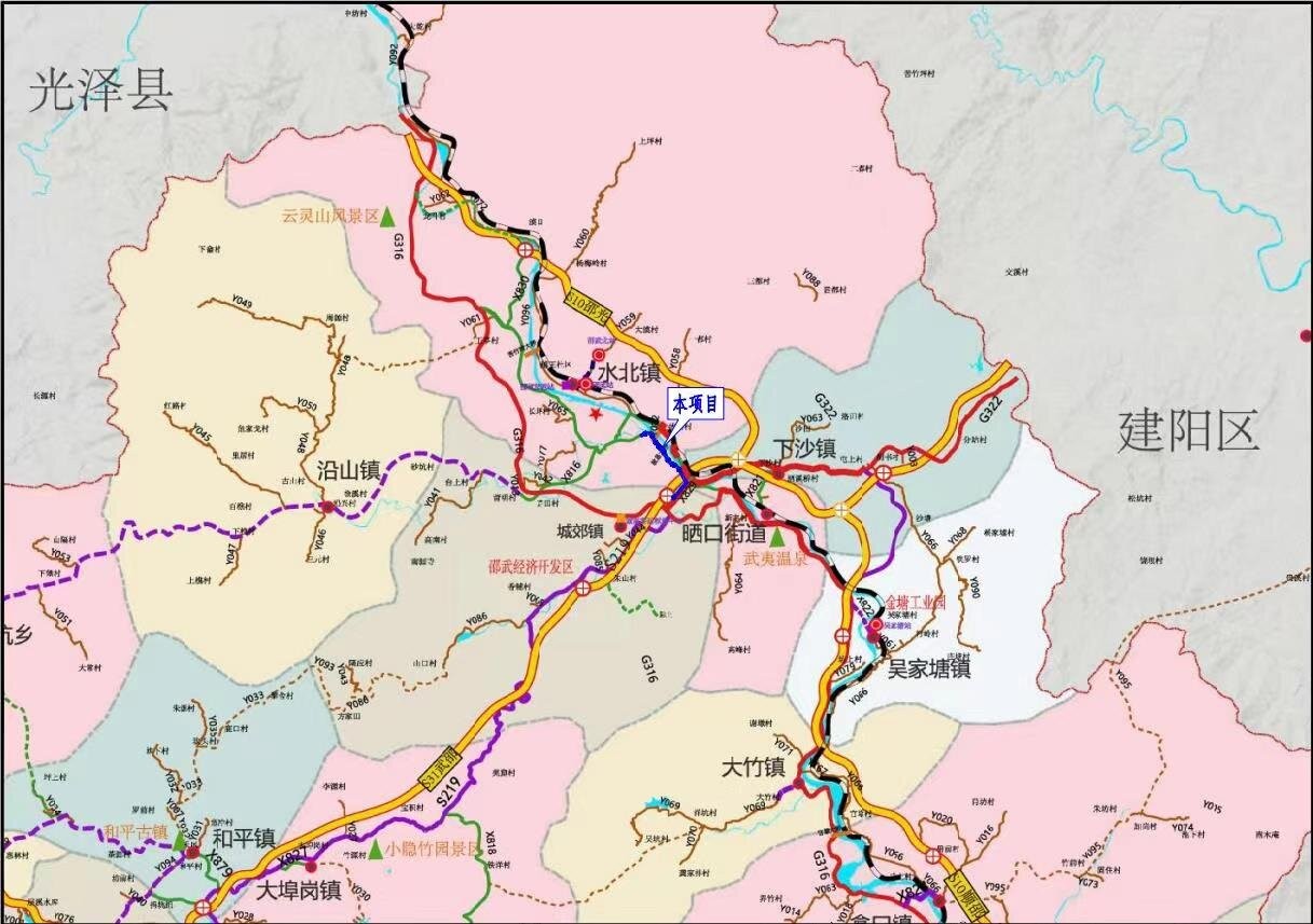 该项目起点位于邵武收费站接线与国道G322线接线平交口,先沿县道X829洋邵线扩建至与县道X832洋王线平交口,再沿县道X832洋王线向西北方向进行改扩建,经莆常村、沙垄、猴子山加油站,终点位于猴子山西侧熙春东路和福寿东路路口平交,建设里程4.26公里,按二级公路建设标准,双向四车道,路面路基宽21.5米,采用沥青混凝土路面。
