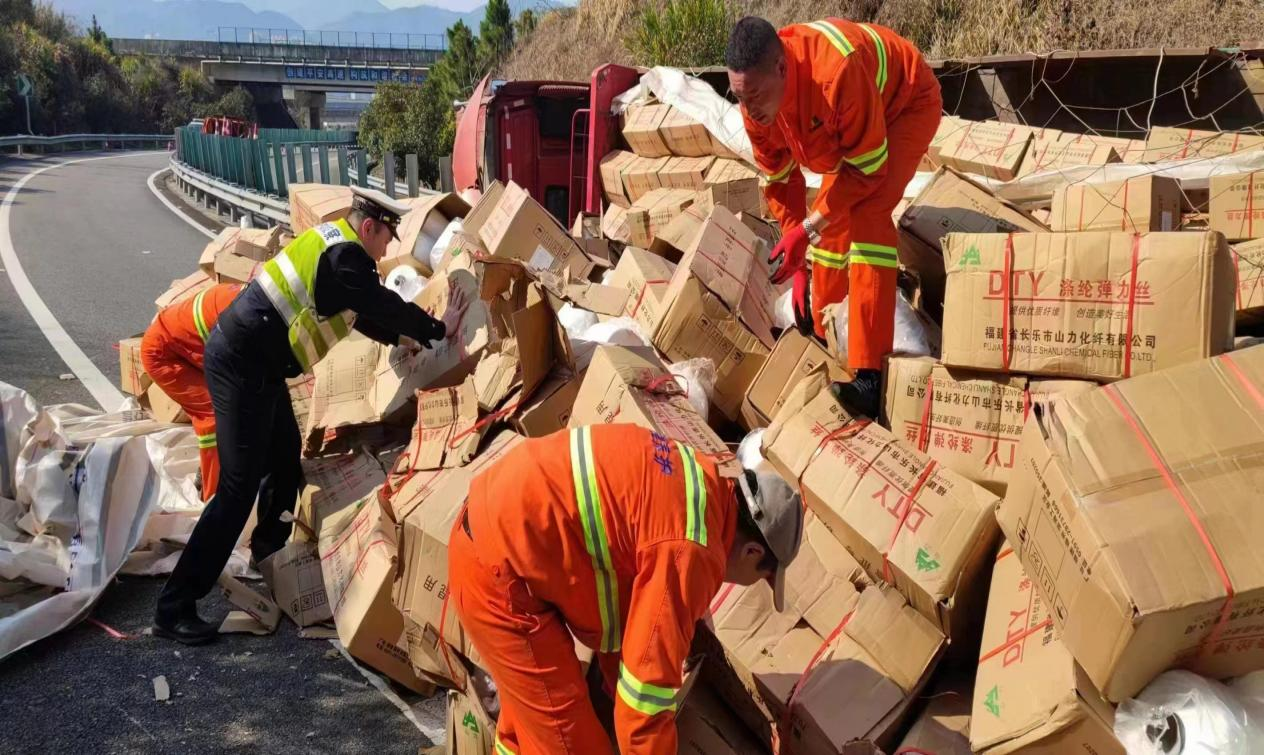 2月23日上午9点左右,一辆大货车在延顺高速公路顺昌匝道处发生侧翻,大量货物掉落堵塞路面,严重影响道路畅通,存在巨大的安全隐患,现场形势十分危急。
