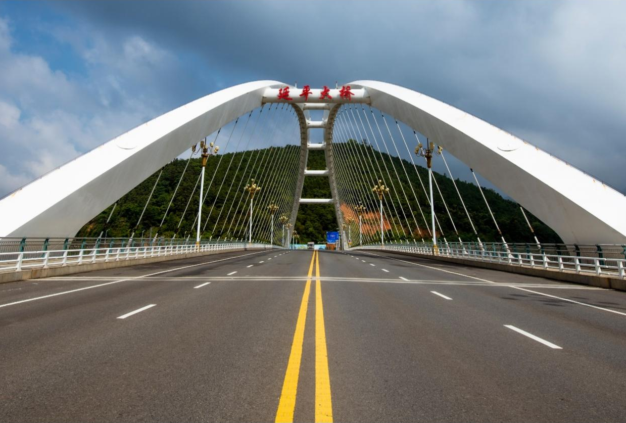 延平大桥(工程名:西芹大桥)位于福建省南平市延平区西芹镇,延平西站东侧,北接205国道,南接行健路,是南三龙铁路延平西站重要的进出通道和配套项目,为福建省省重点工程。大桥全长402.5米,两岸接线道路长999.3米,双向4车道+非机动车道及人行道断面布置,跨西溪河道设计采用主跨230米的下承提篮式钢箱系杆拱桥。做为西芹镇和延平西站的门户形象,桥型方案设计遵循“少即是多”祛除繁复装饰而重视展现桥梁结构自身之美、考虑与周边环境融合协调,给人以良好体验的城市桥梁景观设计理念,主桥桥型桥跨的运用在福建省市政桥梁属创新尝试、国内领先,整体造型简洁现代且不失柔美,为延平这座桥梁博物馆再增一道亮丽的风景线,为当地居民的出行与休闲提供更多便利;结合桥位位于西溪河道弯道且距上游沙溪口水电站较近等特殊水文地质地形条件,创新采用“支架拼装与斜拉扣挂相结合”的非对称缆索吊装施工方案,为国内山区裸岩急流河段的特大跨径拱桥的创新尝试;施工方案优化过程中积极采用BIM+GIS技术模拟仿真施工组织方案、优化施工工序安排,保障创新工艺顺利实现;贯彻桥梁“全生命周期”设计理念,吊杆索体设计选型、桥梁健康监测系统、钢主梁检修小车、钢桥面铺装、摩擦摆球形抗震支座、桥面径流收集系统等创新设计都为特大异形索承体系桥梁的安全稳定运行提供有力保障。
