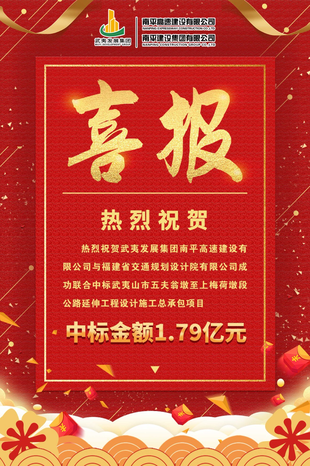 5 月18日,武夷发展集团所属南平高速建设有限公司与福建省交通规划设计院有限公司组成联合体,成功中标武夷山市五夫翁墩至上梅荷墩段公路延伸工程设计施工总承包项目,中标金额179277484元。