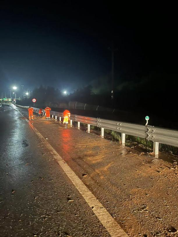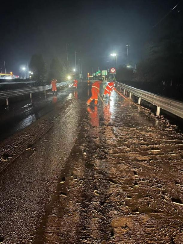 到30日凌晨1点,经过抢险人员5个多小时的连续奋战,堆积于匝道路面的泥沙、杂物等被清理干净,排水系统疏通完成,后广场的泥土和树枝清运完毕,及时抢通了道路,恢复了通行,排除安全隐患,有力及时保障了五一长假期间服务区的畅通和运营。