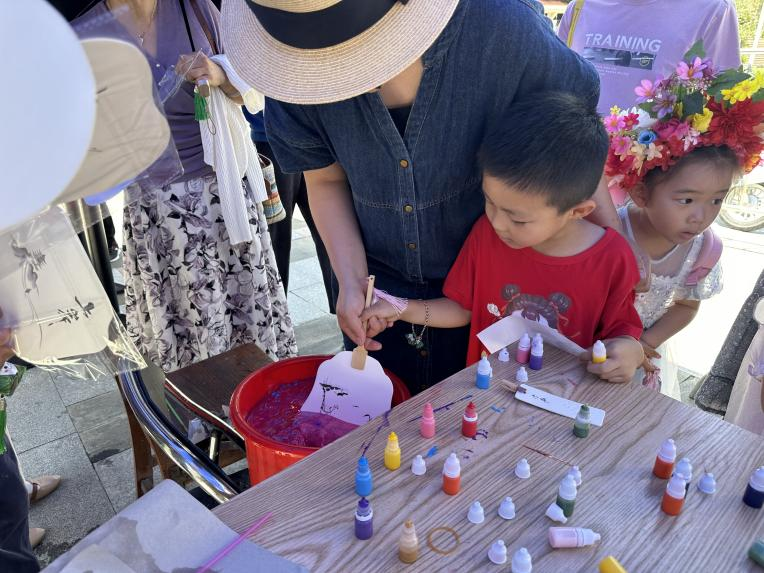 在漆扇制作区,材料整齐摆放,在物业工作人员的“艺术指导”下,将颜料滴入水中,扇子没入水里,制作漆扇。