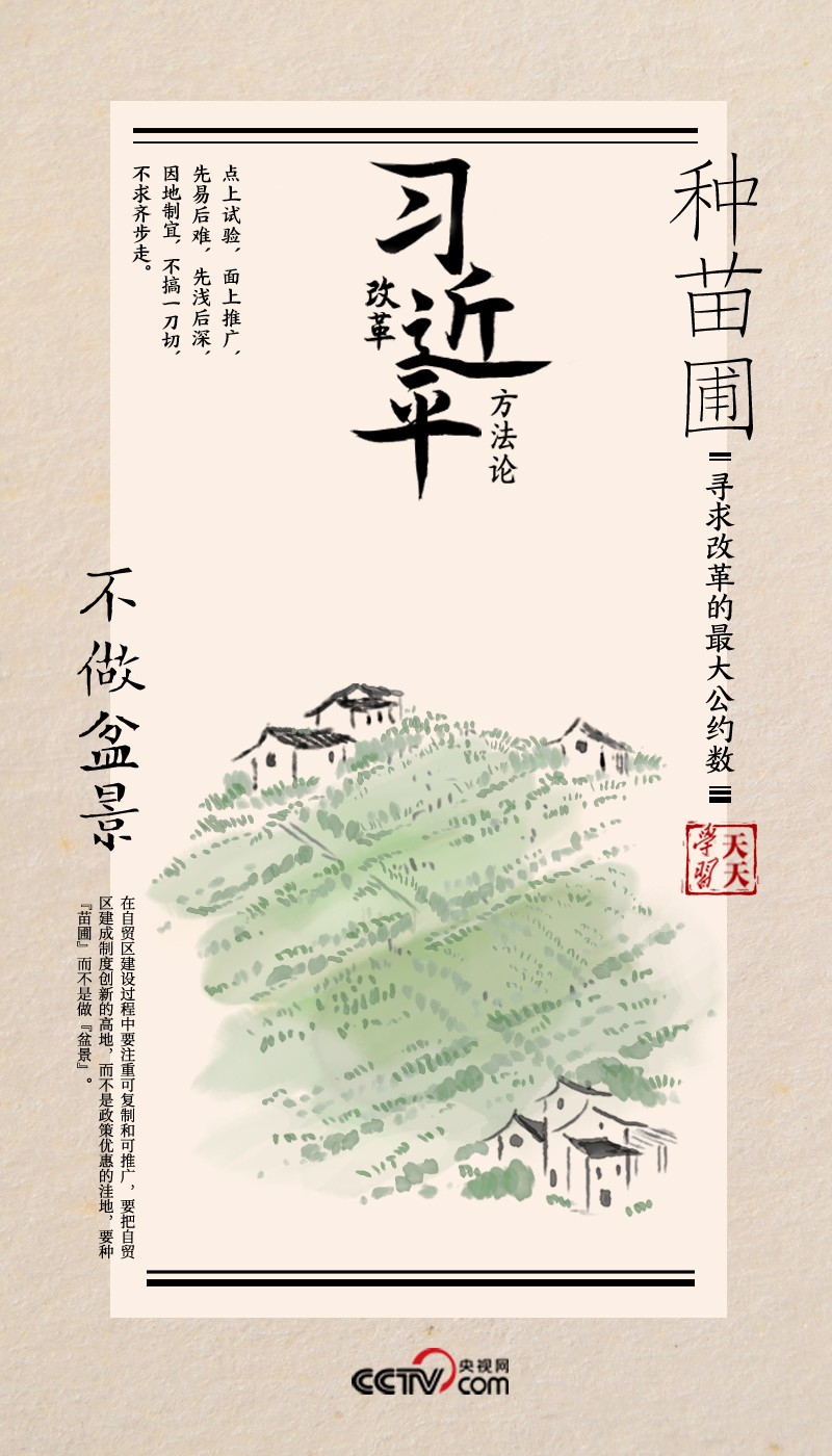 “要种‘苗圃’而不是做‘盆景’”,正是习近平对改革试点方法论的形象比喻和精辟总结。而正定县农村研究所和上海自贸试验区,都是对这一方法论的生动实践。