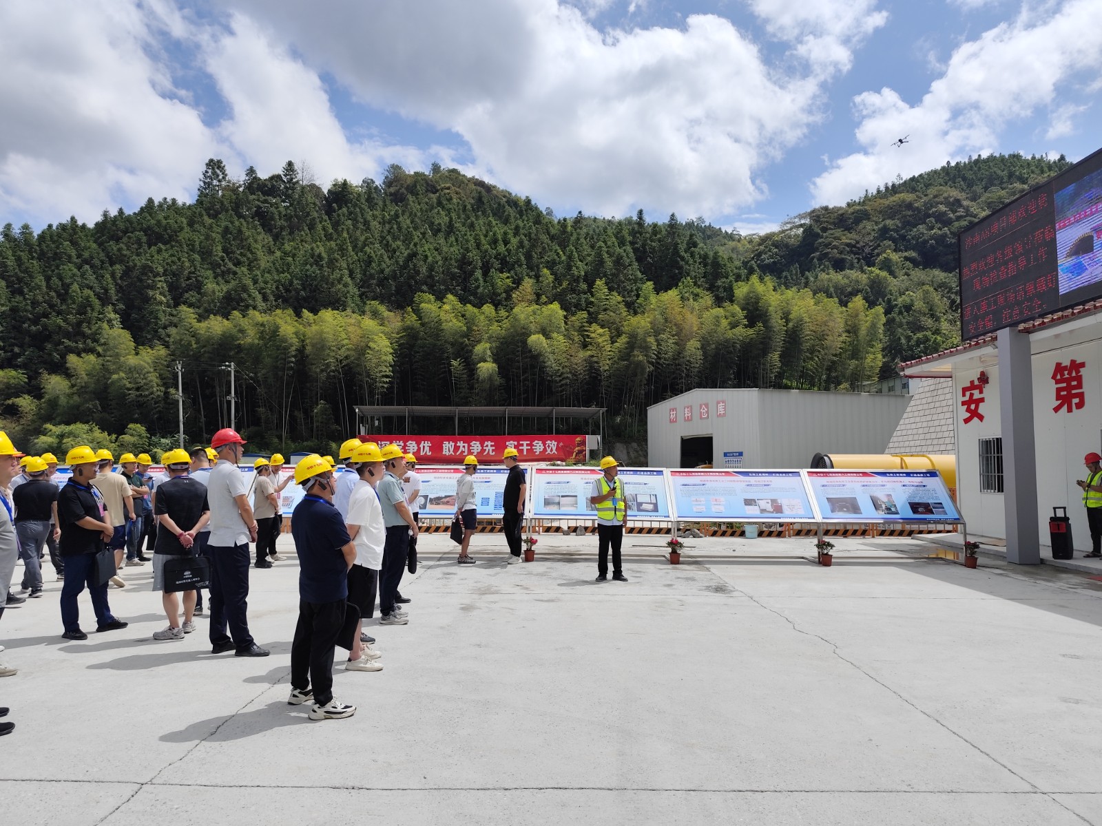 田木芳讲解道,项目始终坚持科技创新,重视安全保障,由此设计研发了一套全方位的隧道安全信息化管理平台。该平台采用“人机料法环”动态管理,进行实时跟踪,杜绝安全隐患,为紧急情况中采取应急措施提供及时、必要的数据支持和技术支持。同时,他还介绍了七宝峰隧道中隧道远距离输送升降压设备、永磁变频轴流式对旋风机、三维激光扫描仪、多功能扫地设备等亮点内容,并与观摩团就防排水标准化施工、洞门墙标准化施工等工作内容进行实地交流和深入探讨。