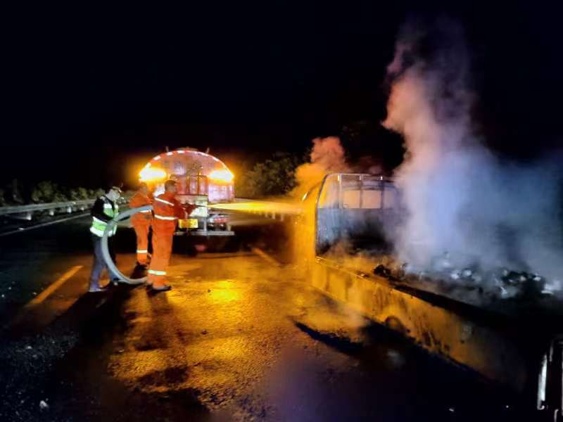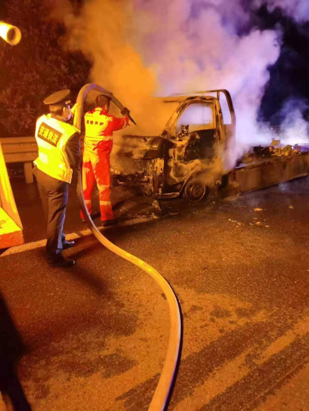 1月19日晚7点19分,高建养护公司浦城南养护站工作人员在路巡时,发现在龙浦高速公路AK2+100处货车发生自燃。面对险情,路巡人员立即调集一台洒水车及多名抢险人员赶赴现场先行灭火。同时启动险情应急预案,通知交警和路政等部门,在相关部门的共同努力下,火势在短时间内被成功扑灭,由于灭火及时,未造成人员伤亡,第一时间保障了人员及道路安全。