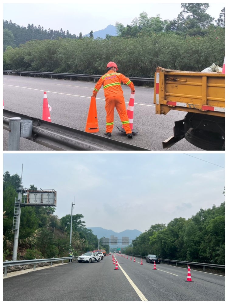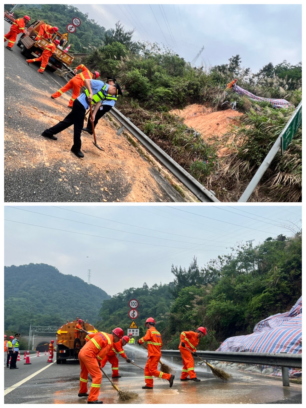 此次演练现场模拟了高速公路边坡水毁溜方现场。“险情”发生后,各演练单位反应迅速,密切配合,高速交警、高速综合执法单位对滞留、过往车辆进行疏导、分流,养护单位对发生险情路段进行安全布控,并以最快速度展开险情处治、应急抢险,清除路面障碍物,疏通边沟,边坡应急防护,第一时间抢险除患保畅通。