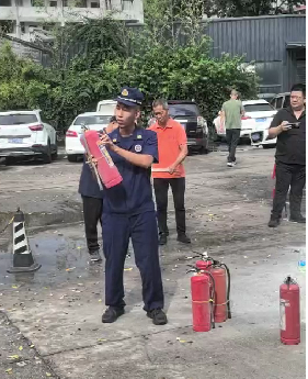 演练以观看安全月专题视频启动,强化“隐患即事故”意识。消防教官讲解火灾预防、逃生知识及干粉灭火器使用方法,并现场演示“提、拔、握、压”操作流程,指导参训人员实操灭火。