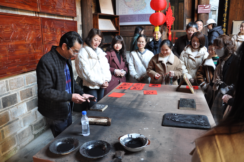 在三色书坊景区,女职工们时而穿梭于古老的街道,驻足于一本本小人书前,与古今书坊人的精神世界共鸣;时而细细端详蜡像馆的“繁华书市”,听它们诉说独属于古时崇化的热闹的市井气;时而“沉浸式”体验建本文化及制作技艺,感悟匠人精神,深刻体会雕版印刷文化的悠久历史。大家在随行讲解与亲身体验的结合中知行合一,感受着书坊曾作为全国三大雕版印书中心之一的辉煌。
